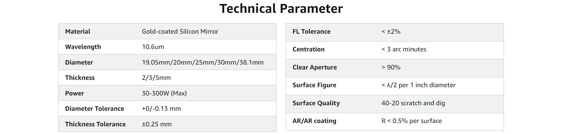 The silicon-plated mirror has good optical thermal properties andfast heat dissipation, suitable for high-power laser tubes.